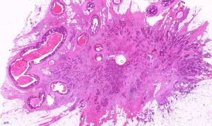 Darüber hinaus erkennt man noch den Anteil von Tumor und Stroma, sowie den intraduktalen bzw. in situ Anteil.